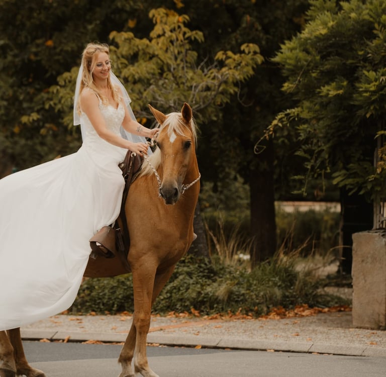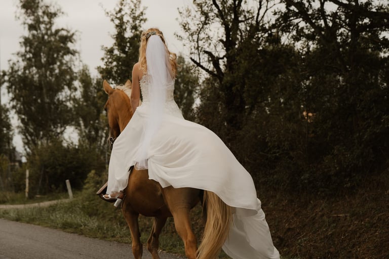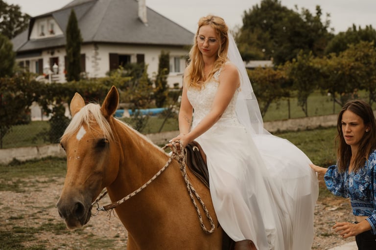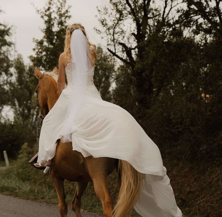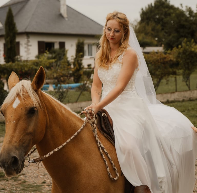 Belle de la Valette n'est pas seulement une jument, c'est une véritable complice. A travers la confiance, la patience et l'attention que nous lui avons consacrées, nous avons construit un lien si fort qu'il nous a permis de vivre une expérience inoubliable : accompagner sa gardienne jusqu'à la mairie pour dire "OUI" à son époux.
