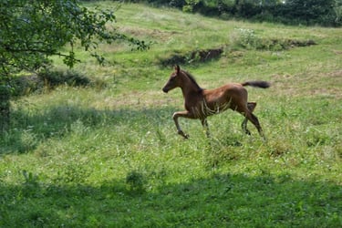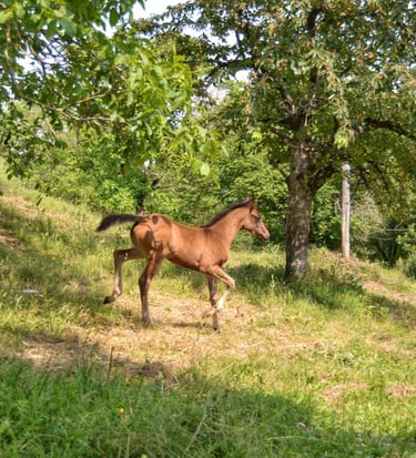 Actuellement Negan vit dans de grandes estives en troupeau homogène avec ses parents ainsi que d'autres poulains et jeunes chevaux. Il sera disponible après valorisation sportive pour excellent projet uniquement.